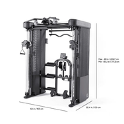 FrameHeavy-duty round tubular steelColourMatte blackFinishElectrostatic Powder CoatWeight Stacks165 lbs (75 kgs)Included AccessoriesTriceps Rope, 6 x 2-Ring Rubber D Handles, Dual Hook Straight Bar, Dual Hook Curl Bar, Ankle Strap, Multi-Function Belt, and 2 x 5 lb Add-On WeightsResistance Ratio0.084027778Muscle Groups:AllDimensions (W X L X H)64” x 52.4” x 83.2” (162.6 cm x 133.1 cm 211.3 cm)Weight879.6 lb (399 kg)