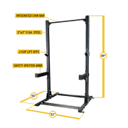 Designed with a 3" x 3" 11-gauge steel mainframe, the SPR500 provides solid, stable and safe workouts even under the heaviest training conditions. The SPR500 Commercial Half Rack features laser-cut numbers, premium j-cup liftoffs, safety spotter arms and an integrated chinning bar for pull-ups, chin-ups and upper body development. The hole spacing for the spotter arms are every 1", ensuring users will always find the perfect stretch without fear of compromising safety.